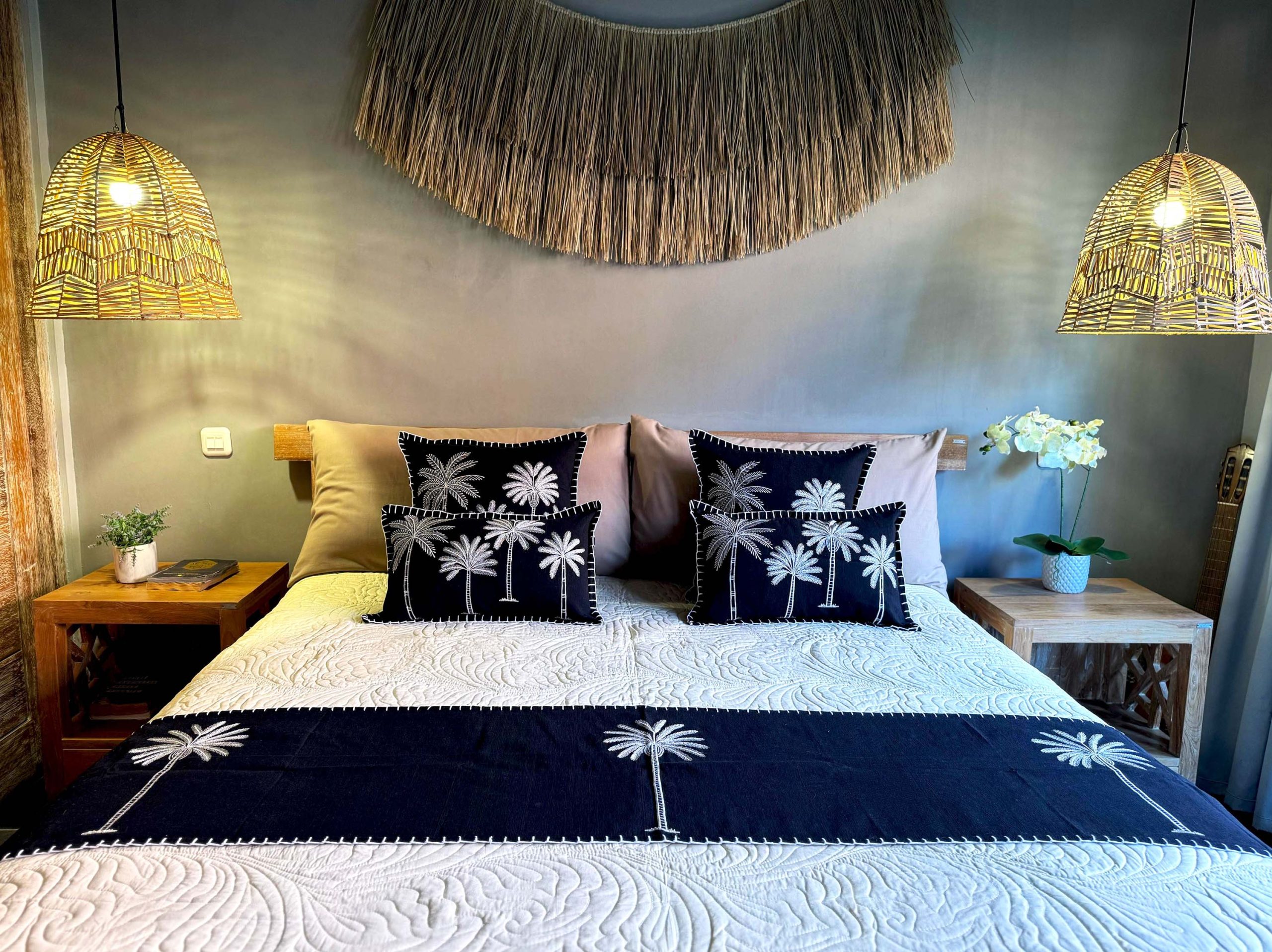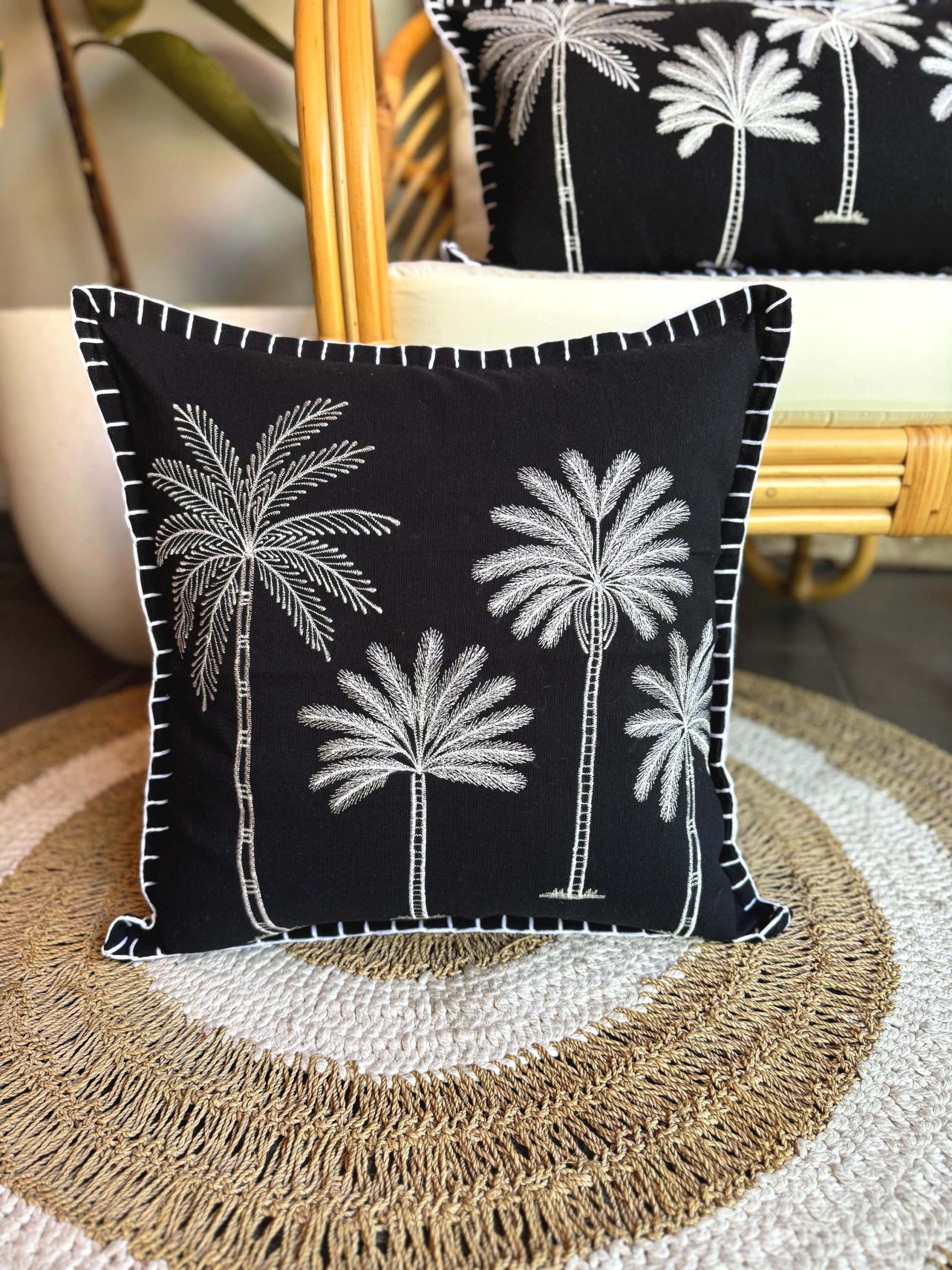 Looking for a unique home decor accent? Look no further than our queen-size bed scarf in thick black weaving cotton with captivating palm tree embroidery.